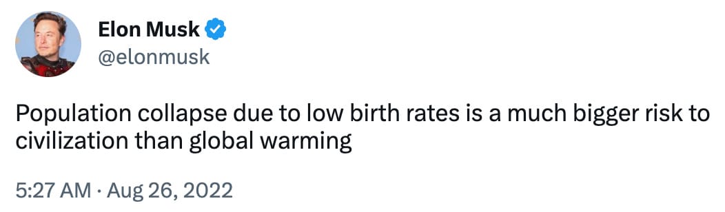 As neo-fascist Republicans simultaneously deny climate change and strip women of the right to abortion in the land of the free under the guise of protecting life, women are also under attack from former Dems who claim population collapse is the greatest threat to mankind and, thus, women having less kids will bring about the end of the world.