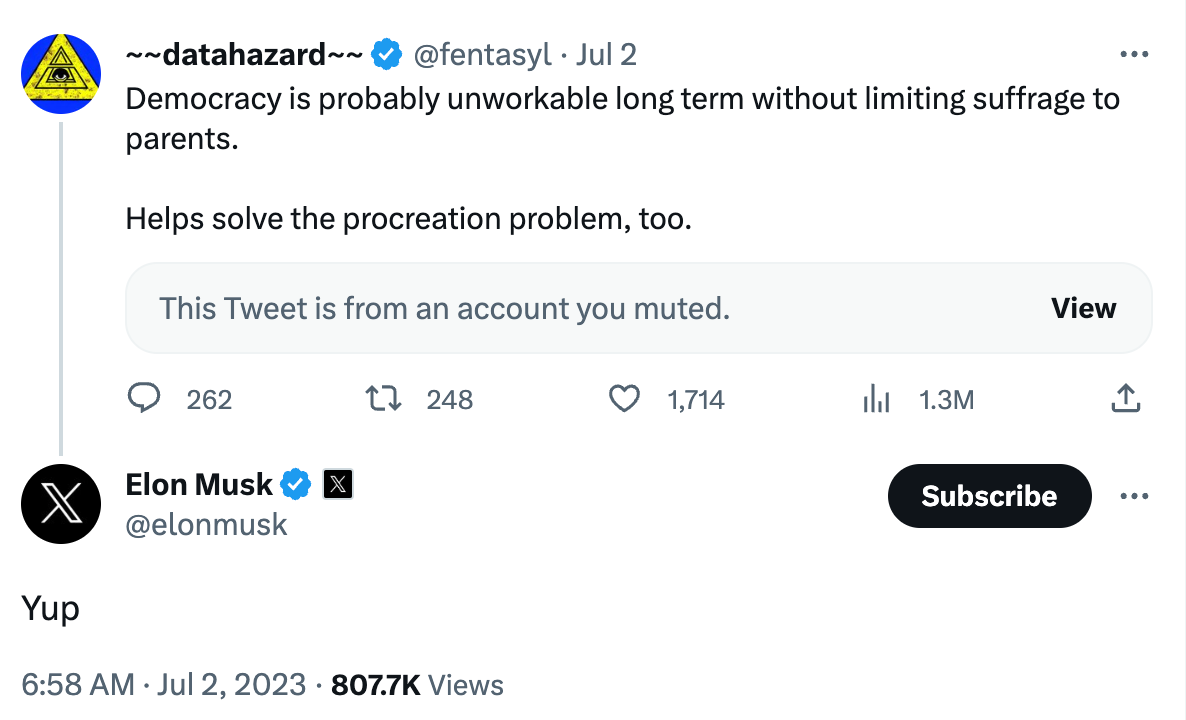 The pronatalist argument seems to have split into two camps, depending on IQ: elite masterminds like Simone and Michael Collins believe smart people need to have lots of smart babies and encourage them to have lots of smart babies themselves. They’ve created a pro-procreation matchmaking service for the intellectual elite (read: white and rich) and plan on having 10 children themselves. They hope their bloodline will outnumber the current human population in just 11 generations and have gone on record saying they believe investing in the top 0.1% is more important than investing in the bottom 10%. Musk is also taking the burden of improving humanity personally, recently donating $10 million to fertility research. With a man as powerful as Musk, though, the personal is always political: he recently tweeted that only parents should have the right to vote given only they care about the future.