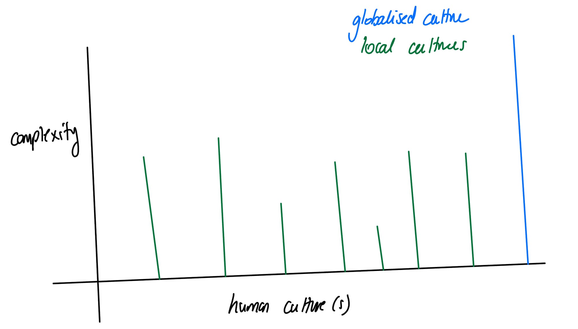On my terrible graph above, I’ve depicted multiple local human cultures and the level of complexity each attained in green. The blue line is the level of complexity attained by one globalised human culture. The blue line is, indeed, taller than any of the one individual green lines representing these local cultures. However, these local cultures existed simultaneously, even if they weren’t connected, and if you take the sum of their complexity, the total complexity of the world would vastly outstrip the complexity of a the single globalised culture.