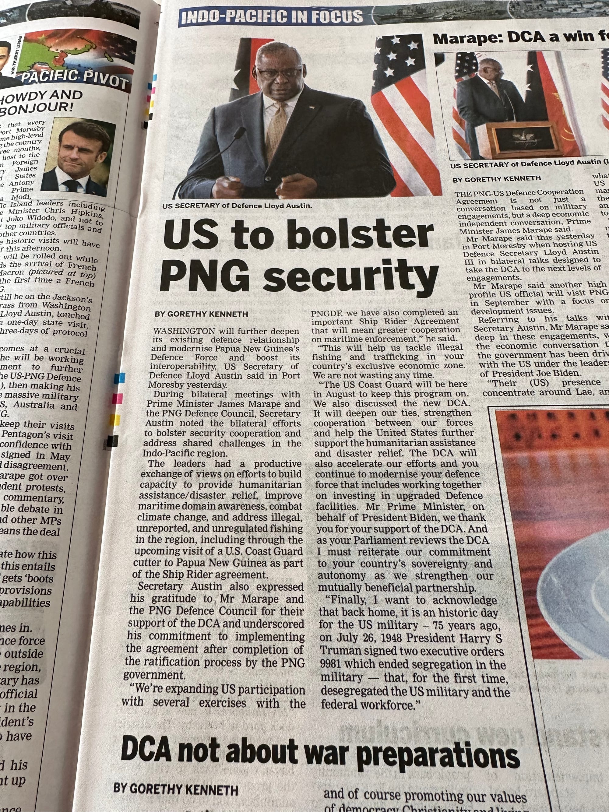 The Americans seem to think so. Their Secretary of Defence, Lloyd Austin, suddenly arrived in PNG the day before Macron’s visit. A Defence Cooperation Agreement was signed, whereby the USA promised naval support to “tackle illegal fishing and trafficking in your country’s exclusive economic zone”. Funnily enough, the following day, Macron also offered naval support in the same stretch of water against illegal fishing.