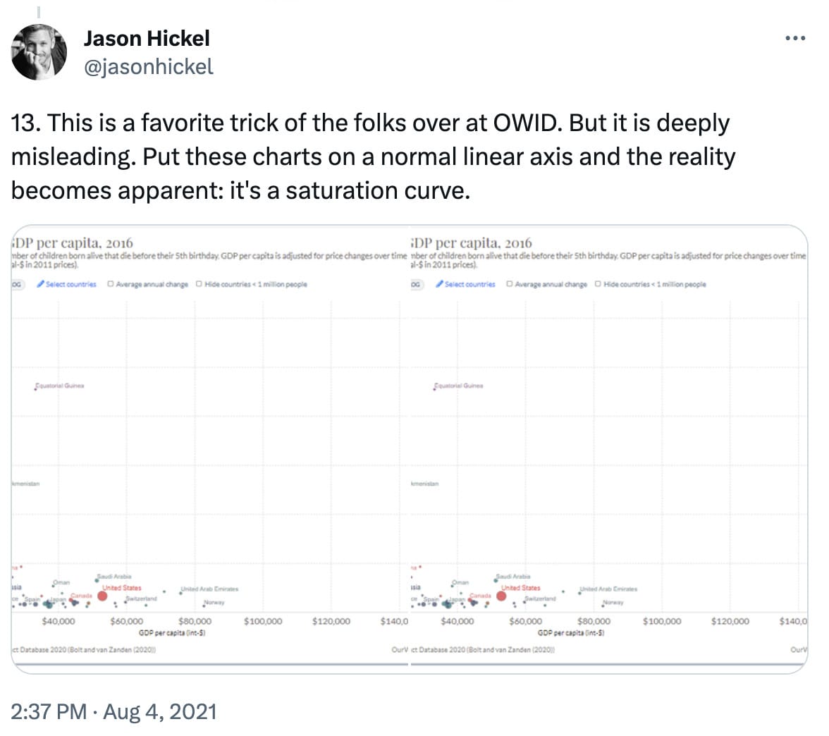 Degrowth scholar Tim Parrique is the latest to raise concerns around OWID’s methodologies: “Publishing raw data without analysis is not science.” Parrique has worked at length to debunk “green growth”, the harmful myth that sustainable economic growth can be done within the planetary boundaries, a stance OWID supports. Parrique’s work comes after economic anthropologist Jason Hickel published this rebuttal to OWID claims about economic growth and poverty in 2021.