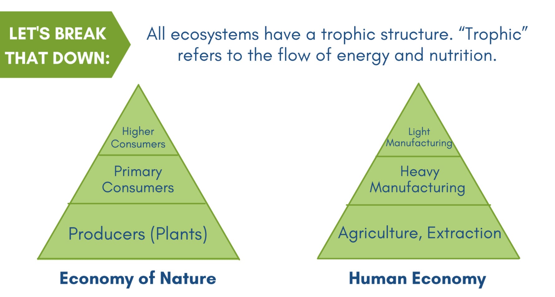 So as technology becomes more complex, we have to go through each stage of the pyramid in order to access it, we cannot just get to complexity while skipping the lower rungs. Now, that means the more rungs or layers we add to the pyramid, the larger that bottom layer must become. The bottom layer represents the expansion of agriculture and extractive industries like logging and mining.