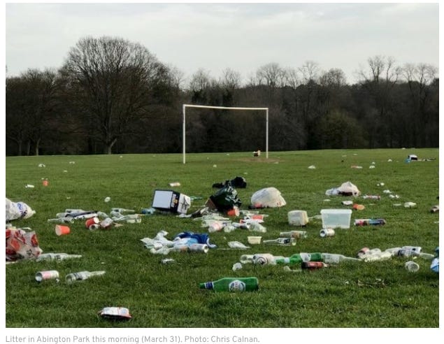 No matter what the Sheffield Telegraph would have you believe, leaving trash behind in a public park is perhaps the most innocuous form of littering—large patches of grass in urban areas typically do not support vibrant ecosystems, and, ultimately, the state will send out its band of cleaners to clear the place of both trash and people: “public” is a euphemism for temporarily available, as the closures of parks have shown.