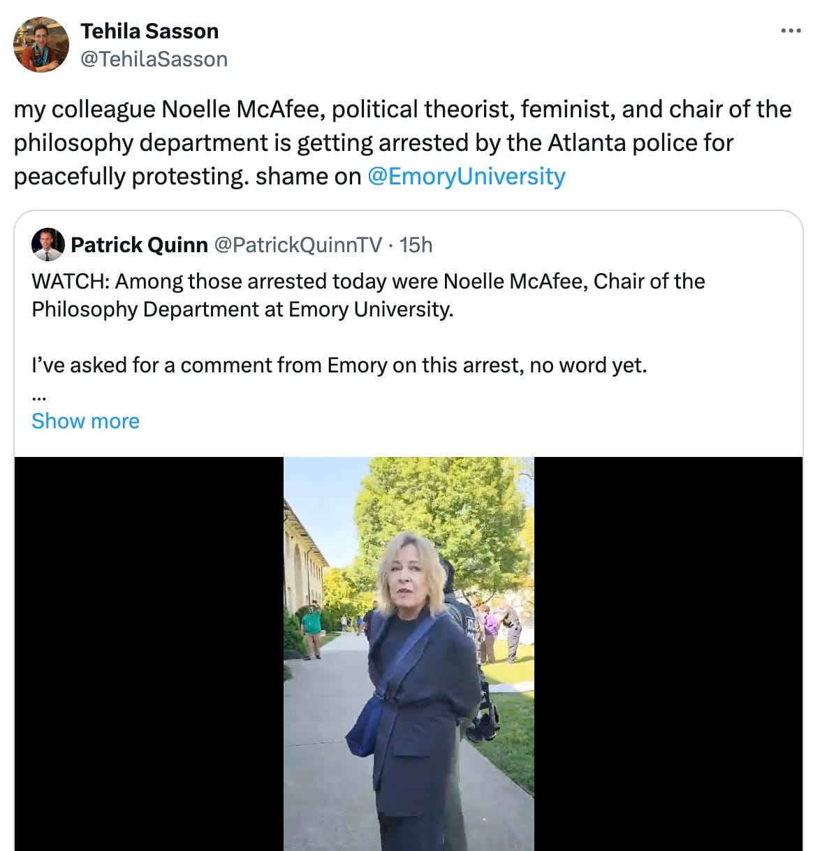 We are faced with unspeakable horrors. Horrors that cannot be bound in the stories we tell about the world, horrors that choke our throats with sobs or fill our chests with screams. We cannot speak through such fear, terror and rage. Horrors are felt in the body, where language does not rein. It’s why civilians take to the street to be heard—because there are no words for what we need to say. It’s why students are camping on campuses—because speech fails. And it’s why police are violently arresting them—there is no mercy for the unspeakable because the unspeakable speaks to violence, and we live in States that deny their own violence. Students must be locked up because the State denies Israel’s violence in Gaza; students must be locked up because the State is only interested in language it can control and to control bodies you must incarcerate them.