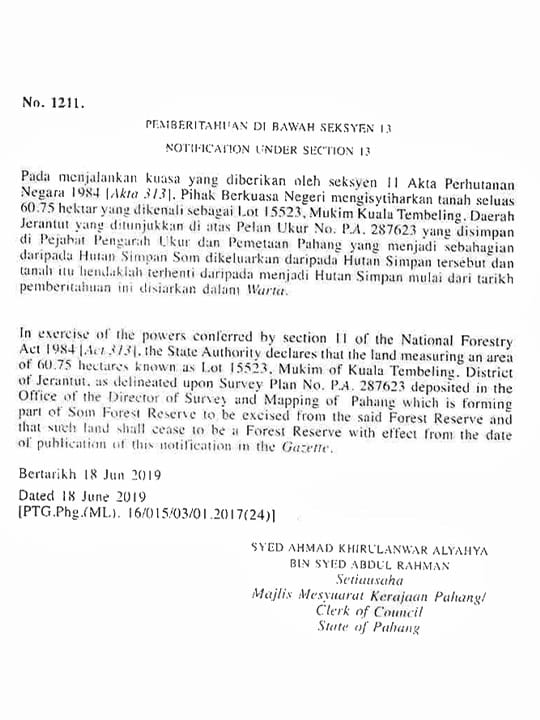 News of the Som Forest proposal was first reported by independent news site Malaysiakini on June 21, just weeks after the state government approved mining operations beside Lake Tasik Chini, a UNESCO Biosphere Reserve, despite the lake and its surrounding area being gazetted as a state park and permanent forest reserve. The royal heads of state had recently made a public pledge to rehabilitate the lake which has suffered under decades of nearby excavation operations. However, journalists discovered the company leading the project, Golden Prosperous Resources Sdn. Bhd., was appointed by Hanishah Ventures Sdn. Bhd., a private company owned by two members of the royal family of Pahang state, one of whom is the aunt of Malaysia’s current king.